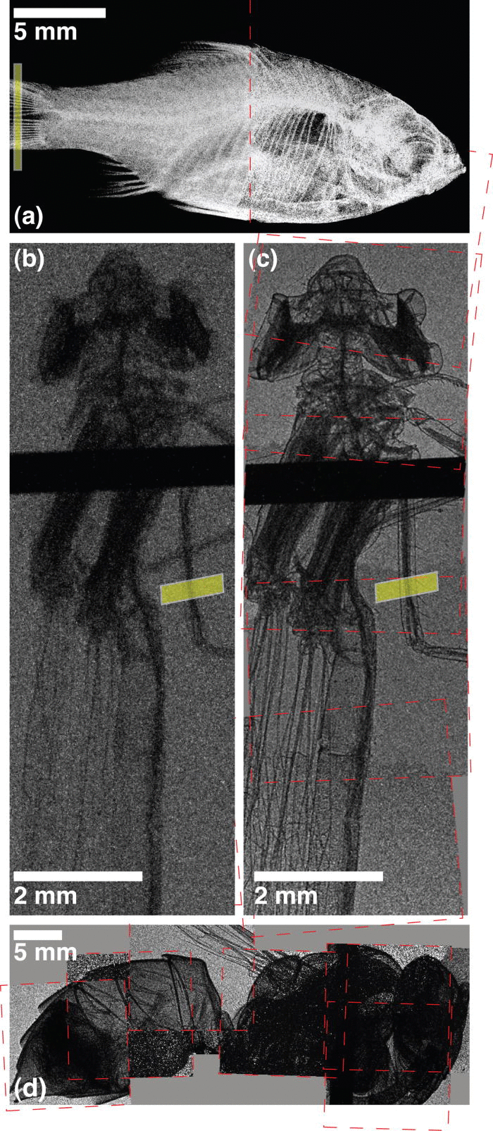 X-ray absorption contrast image of (a) an orange tetra fish and (b) a damselfly and x-ray phase contrast image of (c) a damselfly and (d) a yellow jacket. Images are taken with betatron radiation from a laser wakefield accelerator. (Credit – Applied Physics Letters 2011)